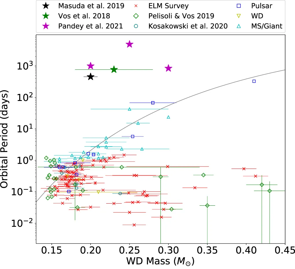 Figure 2: Mass orbital period diagram of a small mass white dwarf. The solid gray line represents the relationship between the mass and orbital period of the companion star of a white dwarf formed by a stable material transfer channel. Image source: Khurana et al.(2023)