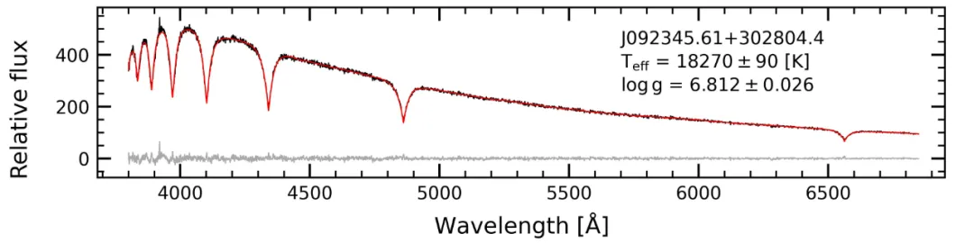 Figure 4: Low resolution LAMOST spectra of extremely low mass white dwarfs. The solid lines in black, red, and gray represent observed data, theoretical spectra, and fitting residuals, respectively.