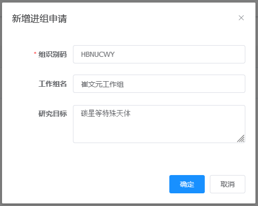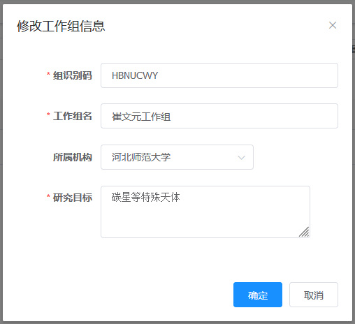 应用场景:新注册的用户试用系统后,准备成为系统的忠实用户,准备加入某工作组 与其他用户协同开展研究性学习或实际研究工作,方便同组的天文学家、天文教育工作者识 别,因此需要补充完善个人信息,同时查看核实信息是否准确,核实自己所在工作组情况。