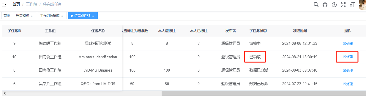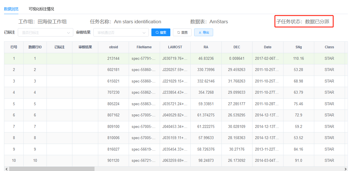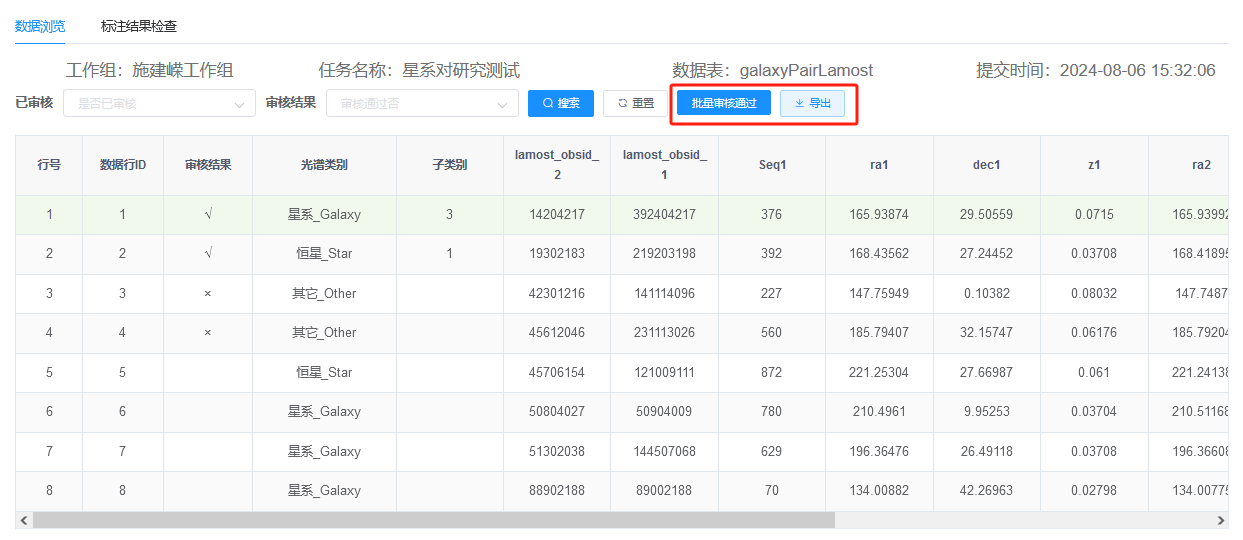 5、几十条光谱,只要有一条被审核,整个子任务的状态就会被自动标记为“审核中”; 如果已经全部被审核,只要有一条审核不通过,整个子任务的状态就会被自动标记为“审核 未通过”;如果已经全部被审核,而且全部审核通过,整个子任务的状态就会被自动标记为 “审核通过”。