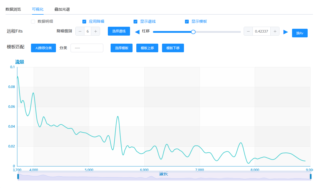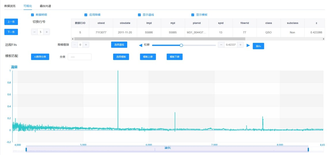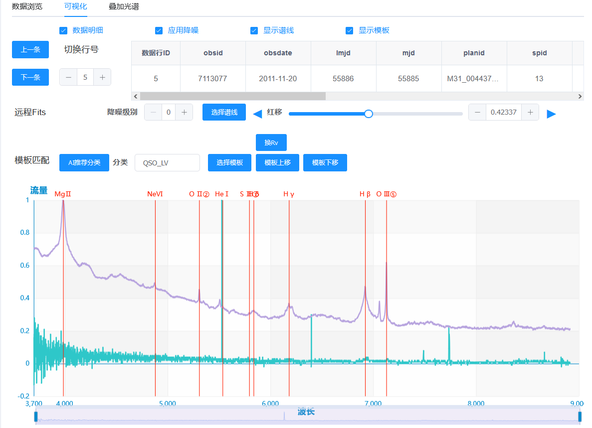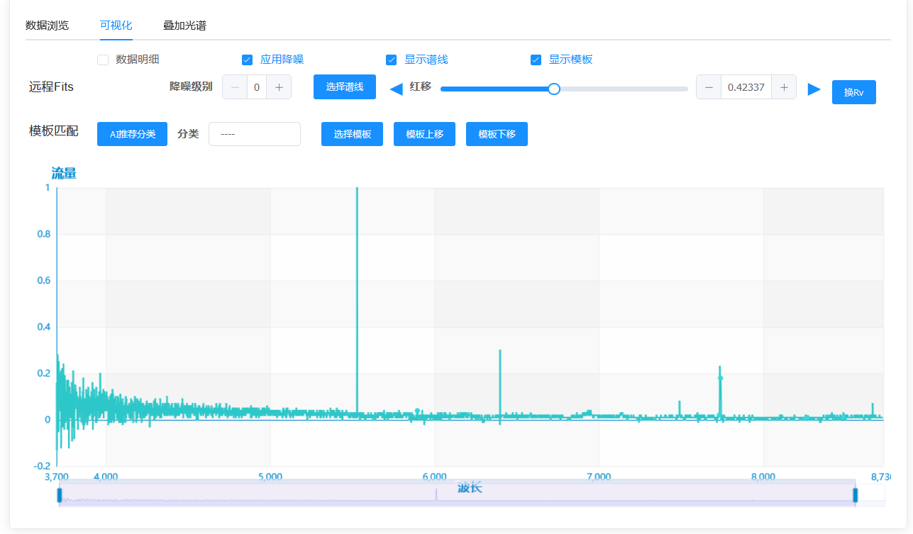 3、在平台上浏览公共数据资源(PUBLIC DB),观察星表数据,观察光谱数据的可视化 效果;基于 AI 初步判断其分类;调出对应的光谱模板进行形状比对;参考发射谱线和吸收 谱线,调整红移值(视向速度)完成精确匹配。如果不能精确匹配,换其它模板。