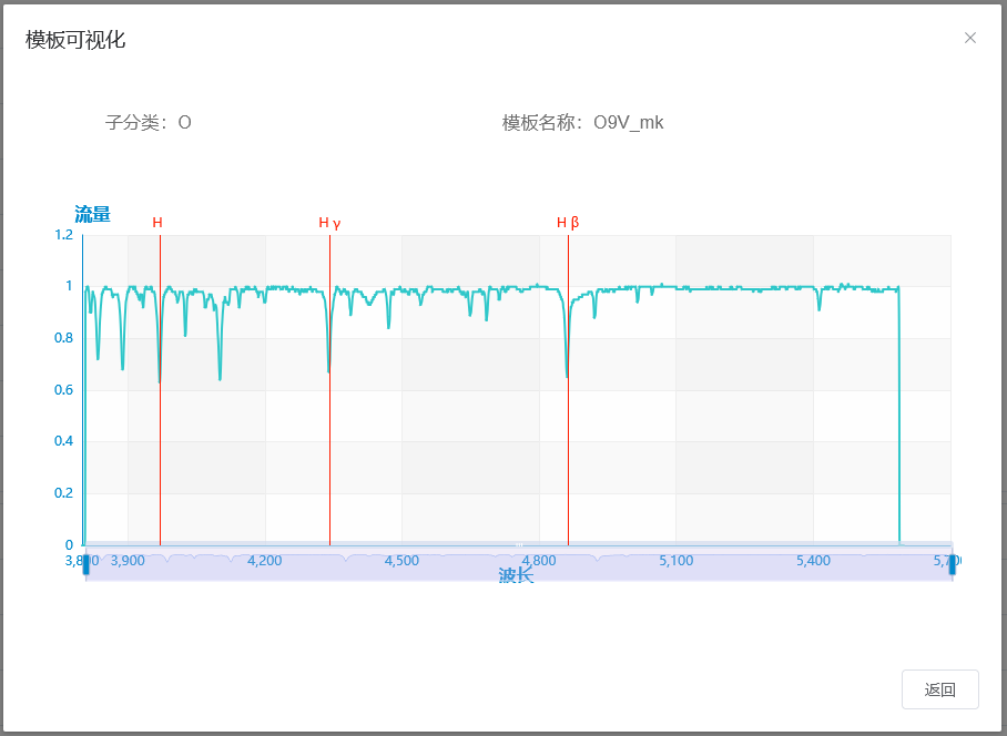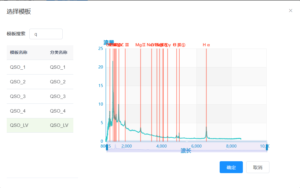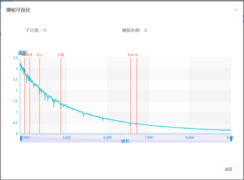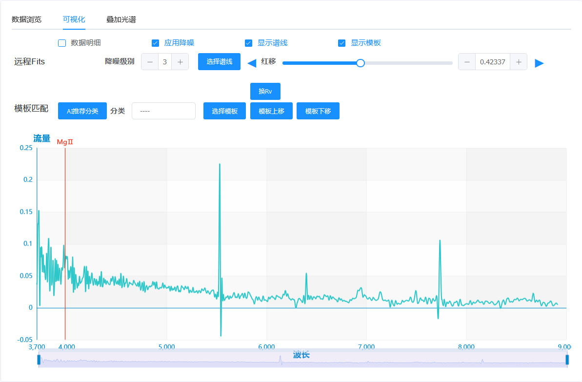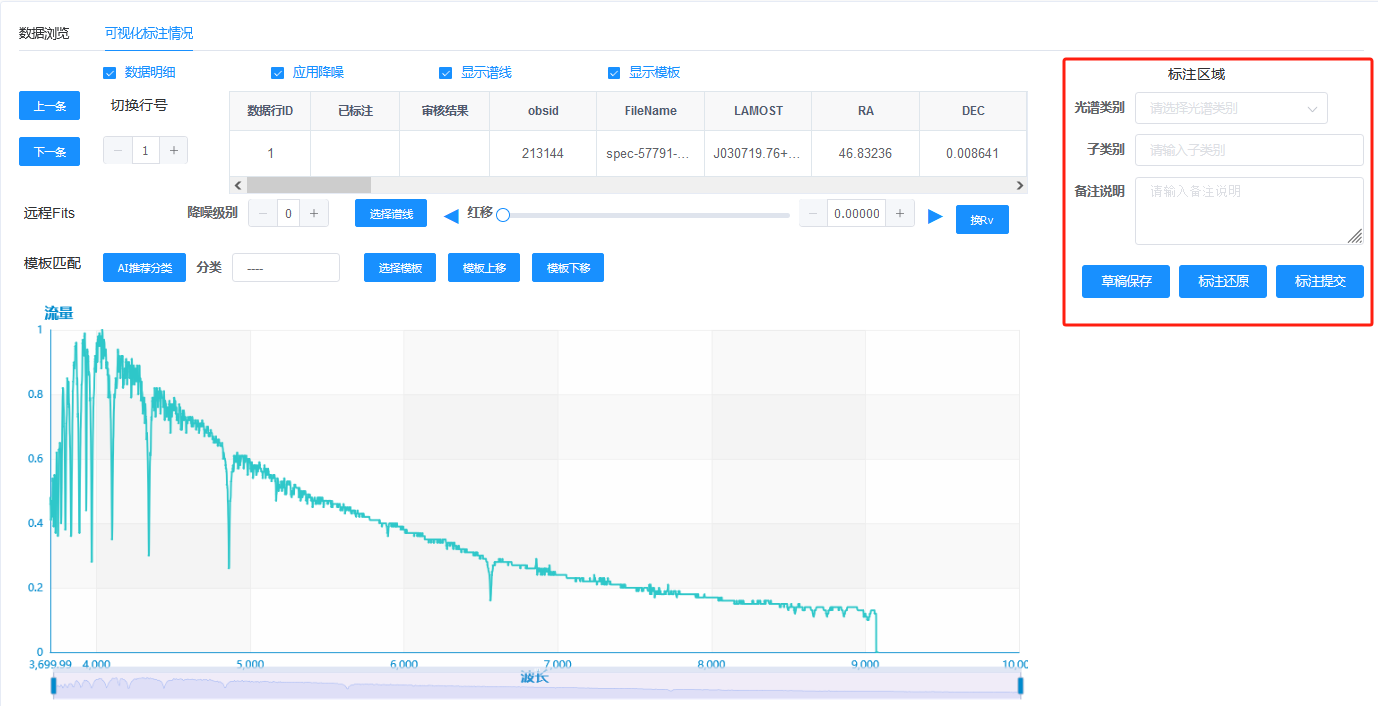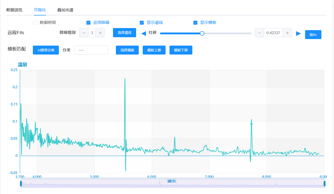 3、在平台上浏览公共数据资源(PUBLIC DB),观察星表数据,观察光谱数据的可视化 效果;基于 AI 初步判断其分类;调出对应的光谱模板进行形状比对;参考发射谱线和吸收 谱线,调整红移值(视向速度)完成精确匹配。如果不能精确匹配,换其它模板。