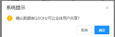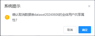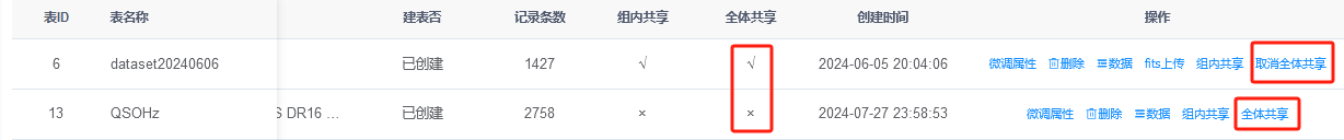 在上图中,表“QSOHz”目前还未开放公共访问权限,“全体共享”这一列内容显示为 “×”, 点击右侧的“全体共享”超链接,可以开放公共访问权限;表“dataset20240606”目 前已开放公共访问权限,“全体共享”这一列内容显示为“√ ”, 点击右侧的“取消全体共享” 超链接,可以收回公共访问权限。