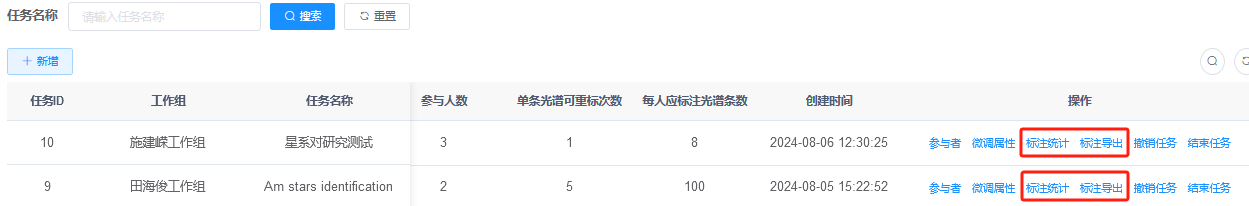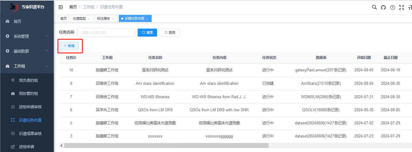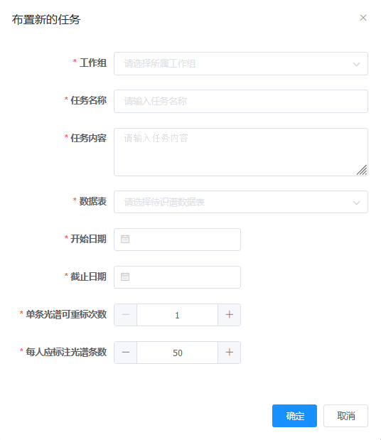 2、点击左上方的“新增”按钮,在弹出对话框中选择工作组、数据表,输入任务名称、 任务内容、任务开始日期、任务截止日期、单条光谱可重标次数、每人应标注光谱条数,然 后点击“确定”按钮保存。