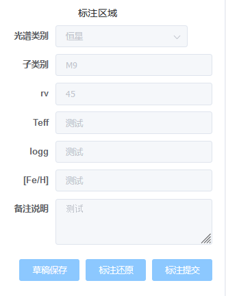 4、填写标注 10 多条光谱的属性值,保存为草稿之后,越来 越熟练,可以回头审视之前填写的内容,有把握之后,逐一点击 “标注提交”按钮,正式提交工作成果。一旦正式提交了工作成 果,子任务的状态就会被改为“标注中”,相关数据行的“已标 注”列会被改为“√”。提交之后,再回过头来查阅,输入区域变 灰,下方的三个按钮也不再起作用。