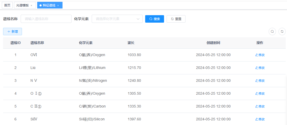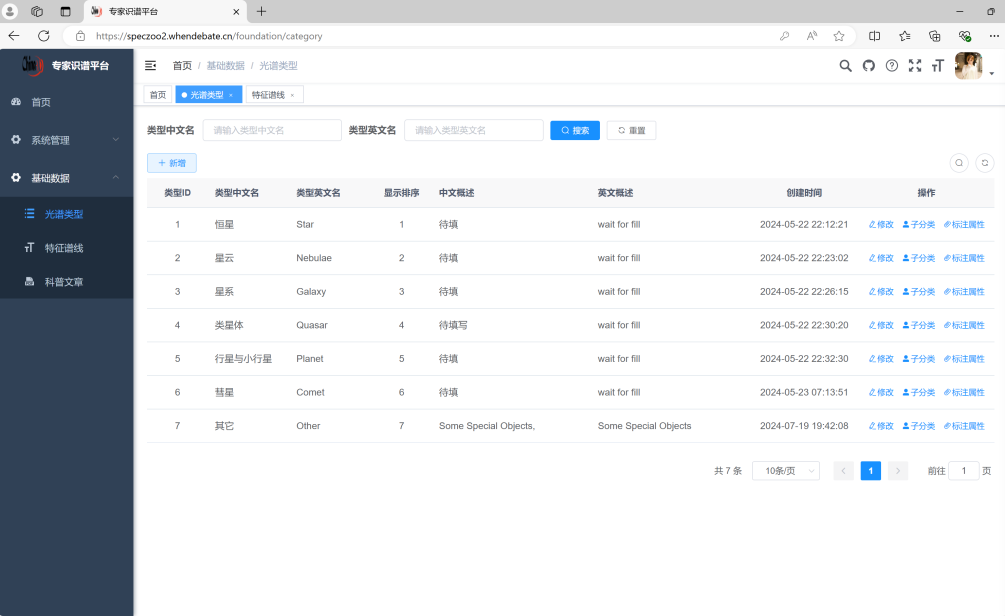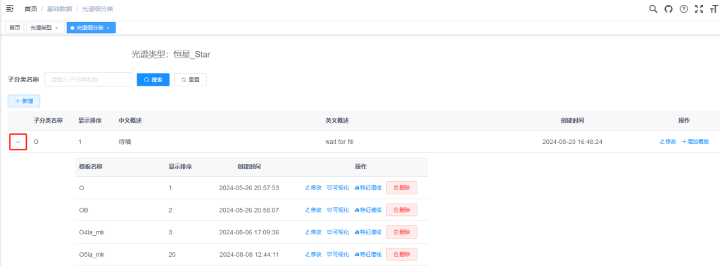 1 、用户在工作环境中,进入“首页/基础数据/光谱类型”菜单。在界面显示的光谱类 型列表找到对应的类型,在同一行右侧操作栏中点击“标注属性”超链接。