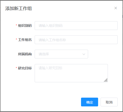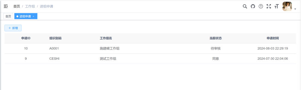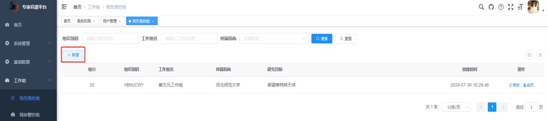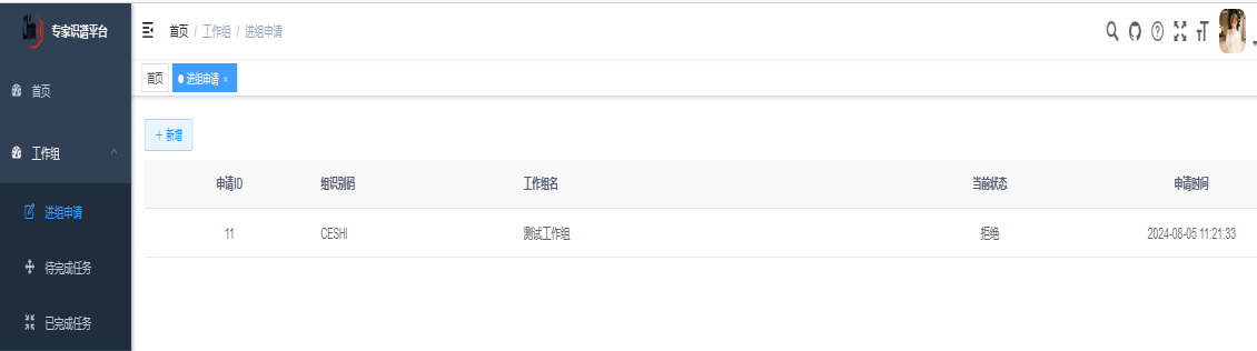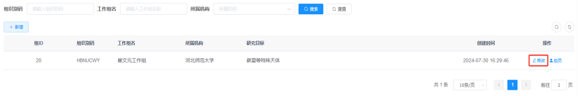 如果已经加入了一些工作组,左侧的“工作组信息”卡片将会列出所有已加入工作组的 组名、当前人数、研究目标。