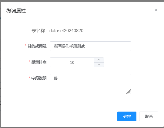 2、界面弹出“微调属性”对话框,用户在对话框中修改目的和用途、显示排序、字段 说明,然后点击“确定”按钮。