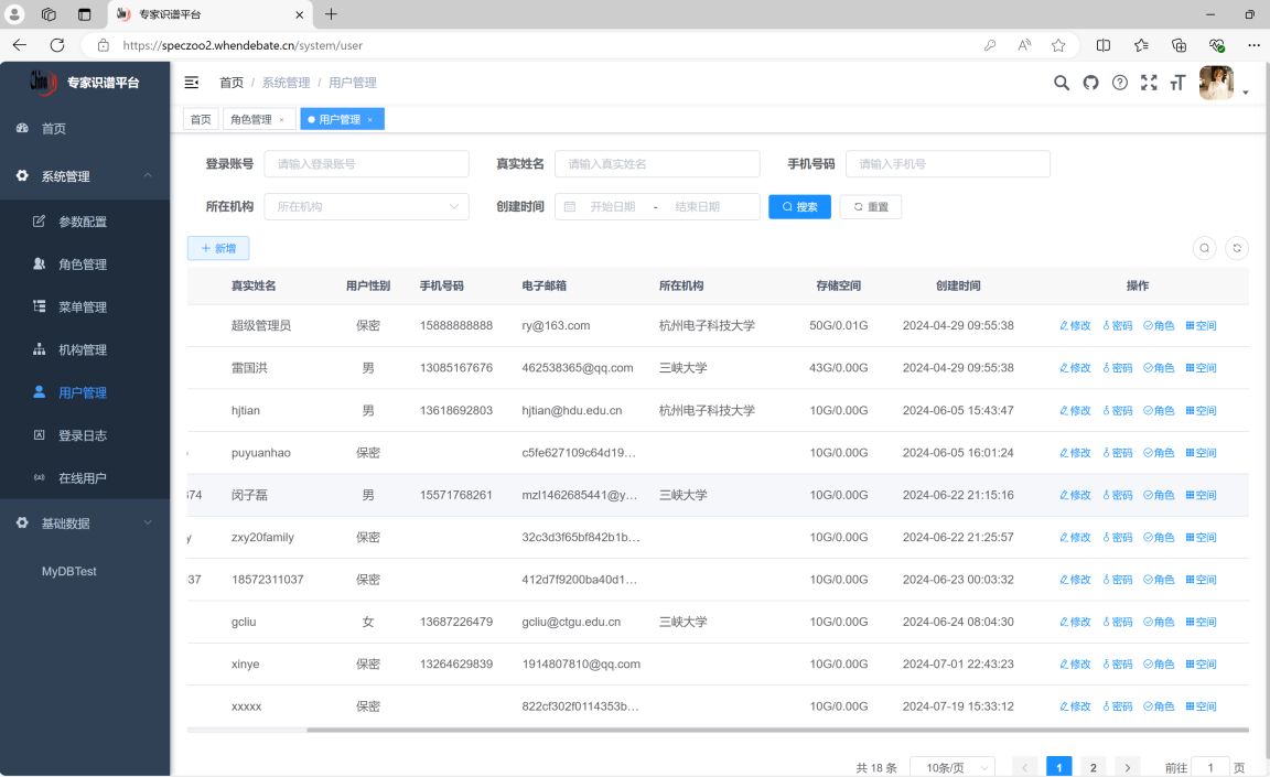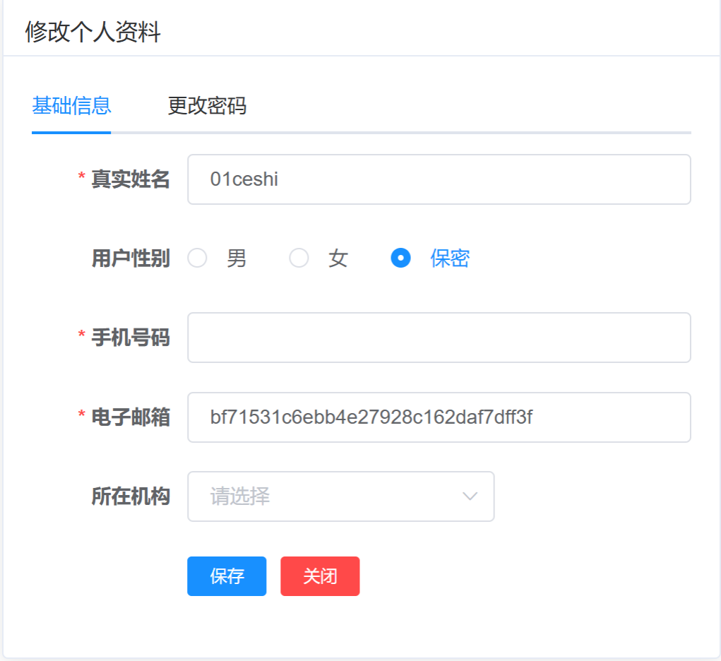 未完善的个人信息“真实姓名”一栏默认与 “登陆账号”相同,“用户性别”默认为保 密,“电子邮箱”为系统随机生成的由阿拉伯数字和英文字母组成的乱码,“所在机构”和“手 机号码”为空。用户应在右侧的“修改个人资料”卡片区域进行完善,详见 4.2。