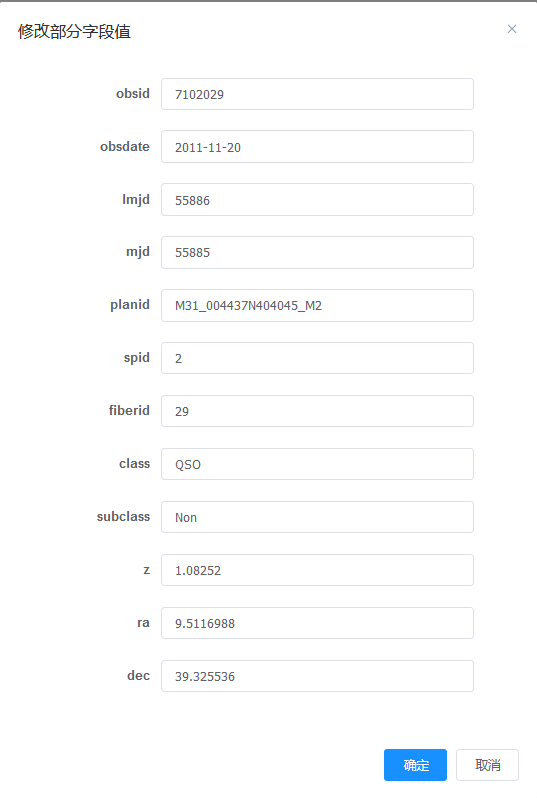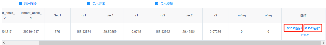 lamost_obsid_2 这两个字段。如此这般,可视化时后台程序才可以分别获取两份远程 fits 文 件。假设两颗星(星系对)的观测数据都来源于 SDSS,系统要求,数据中应有 sdss_plate_ 1、 sdss_plate_2 、sdss_mjd_ 1 、sdss_mjd_2 、sdss_fiberid_ 1 、sdss_fiberid_2 这几个字段。假设两 颗星(星系对)的观测数据,一个来源于 LAMOST,另一个来源于 SDSS,那么,系统要求, 数据中应有 sdss_obsid1 、sdss_plate_2 、sdss_mjd_2 、sdss_fiberid_2 这几个字段。另外,关于 赤经赤纬、红移(视向速度),也有类似的要求,也就是字段名应该用 ra1、ra2、dec1、dec2、 z1 、z2、rv1 、rv2。