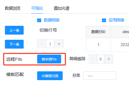 如果这两个条件都满足,可视化界面会多显示一个切换按钮。事实上,如果一切操作正 常,这两个 fits 文件应该是一样的,曲线图表的显示不会有差异。因此,切换到本地 fits 或 切换到远程 fits ,价值不大。
