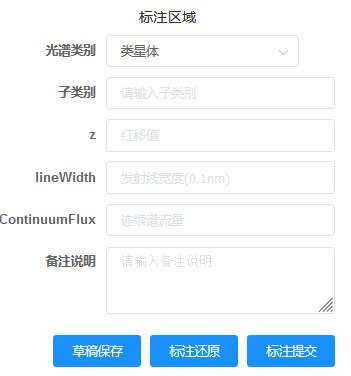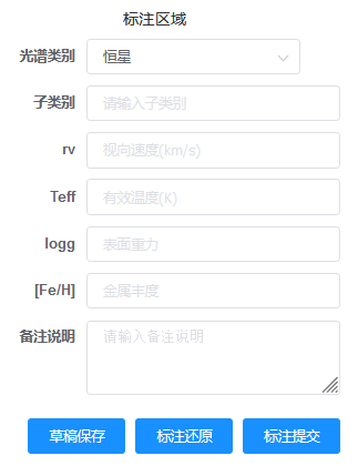 完成任务后提交成果,主要体现在对布置的任务范围内的光谱的属性标注上。不同类别 需要标记不同的物理参数,比如类星体要标注红移值、发射线宽度、连续谱流量等;星系需 要标注红移值、年龄、金属丰度、质量等;恒星需要标注视向速度、表面重力、金属丰度等。为了保持平台的灵活性,系统将这些待标注的物理参数纳入到动态管理范围。