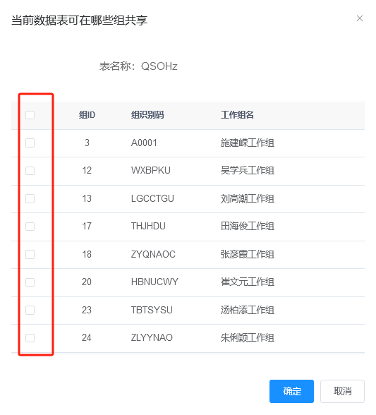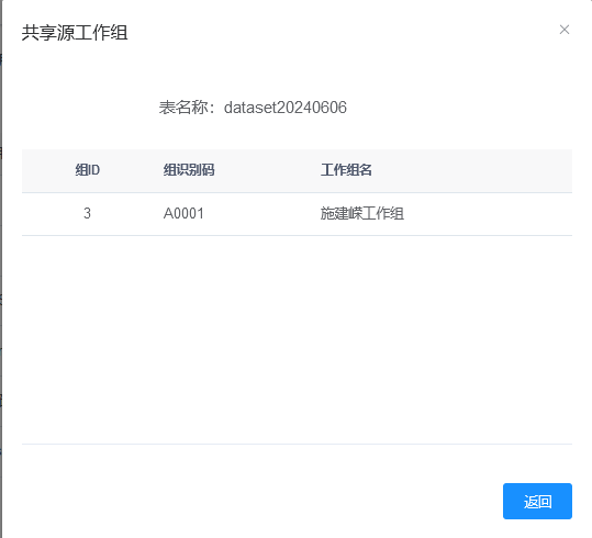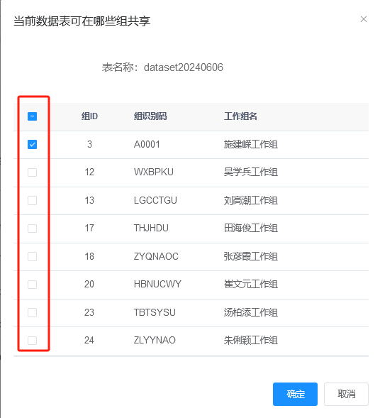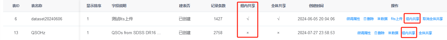 在上图中,表“QSOHz”目前还未开放组访问权限,“组内共享”这一列内容显示为“×”, 点击右侧的“组内共享”超链接,可以开放组访问权限;表“dataset20240606”目前已开放 组内访问权限,“组内共享”这一列内容显示为“√ ”,点击右侧的“组内共享”超链接,可 以继续向自己加入的其它组开放组内访问权限。