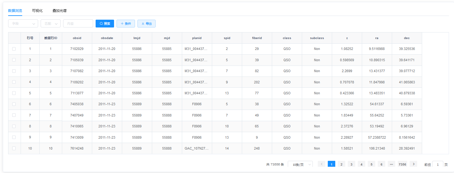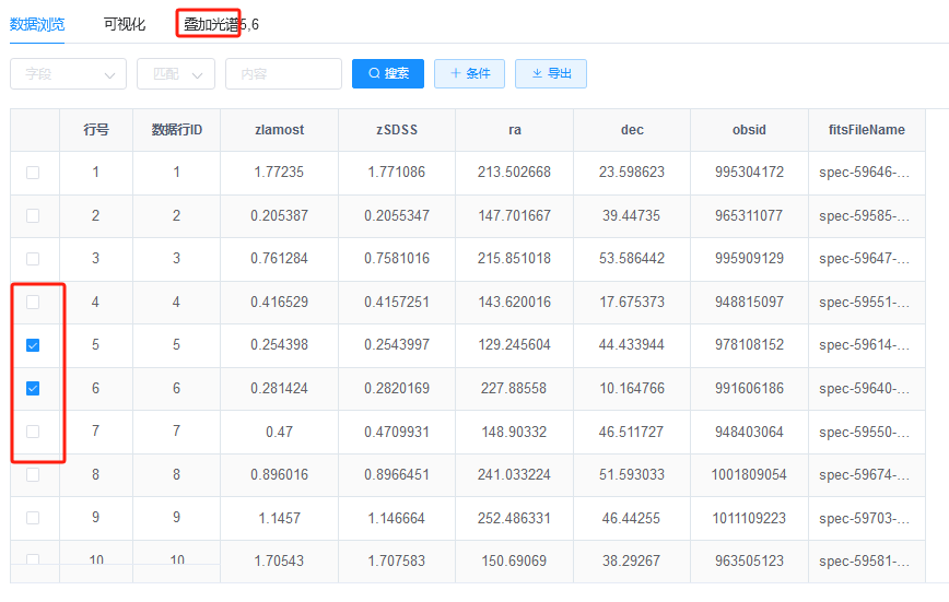 如果星表数据有 fitsFileName 字段,用户可以上传 fits 文件到系统数据库,此后进行光 谱数据可视化操作,可以直接访问系统数据库中的 fits 文件,不再访问远端数据源,响应速 度会有明显改观。