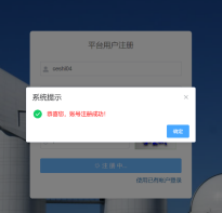 3、输入完成,点击对话框下方的“注册”按钮。如果注册成功,界面将会弹出“恭喜 您,账号注册成功!”的小窗口。点击确定,界面回到登录页。