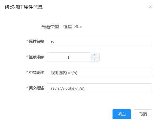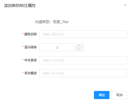 在弹出对话框中填写属性名、中文表述、或英文表述,然后点击“确定”按钮保存。对 于属于同一类型的标注属性,名称应该不同。