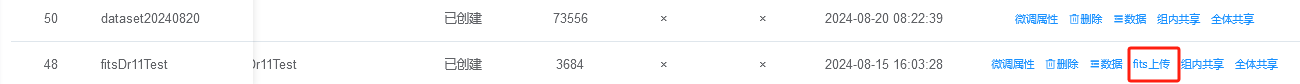 1 、用户在工作环境中,进入“首页/我的数据库”菜单。在界面显示的数据表记录列表 找到对应的记录,在同一行右侧操作栏中点击“fits上传”超链接。