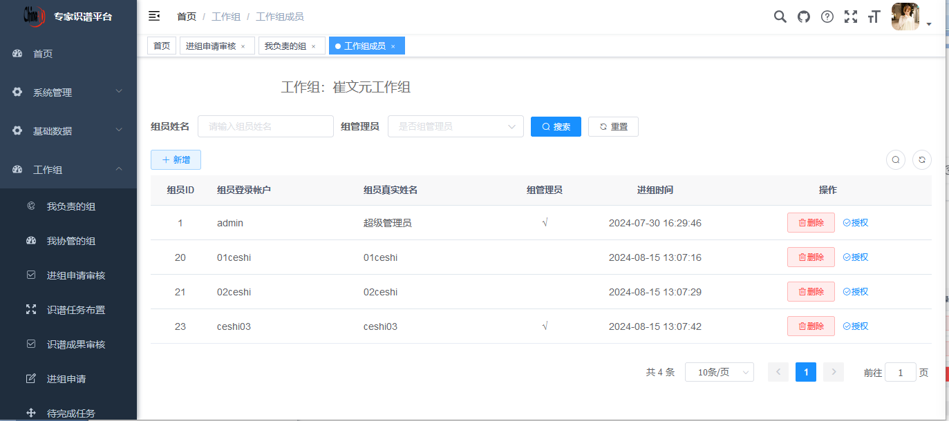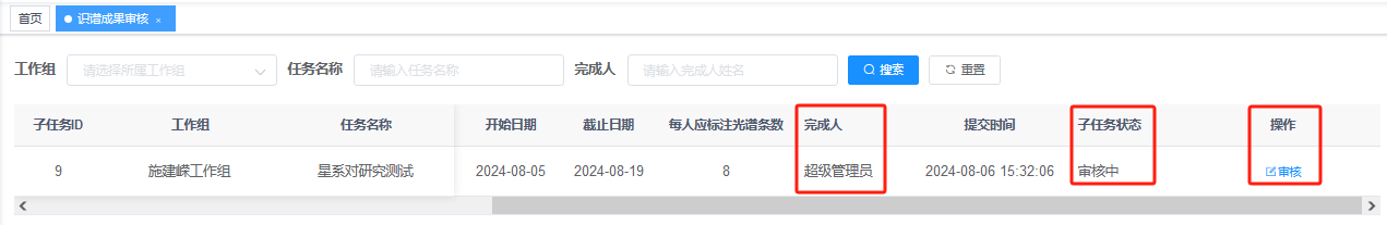 1 、组负责人或组管理员在工作环境中,进入“首页/工作组/识谱成果审核”菜单。界 面会列表显示当前提交了识谱成果的所有子任务,也就是说,如果只发布了一个任务,面向 30 个组员,其中有 20 位已经提交了识谱成果,那就表明有 20 个待审核的子任务,每个子 任务均对应一个具体的完成人。