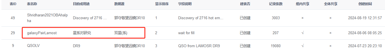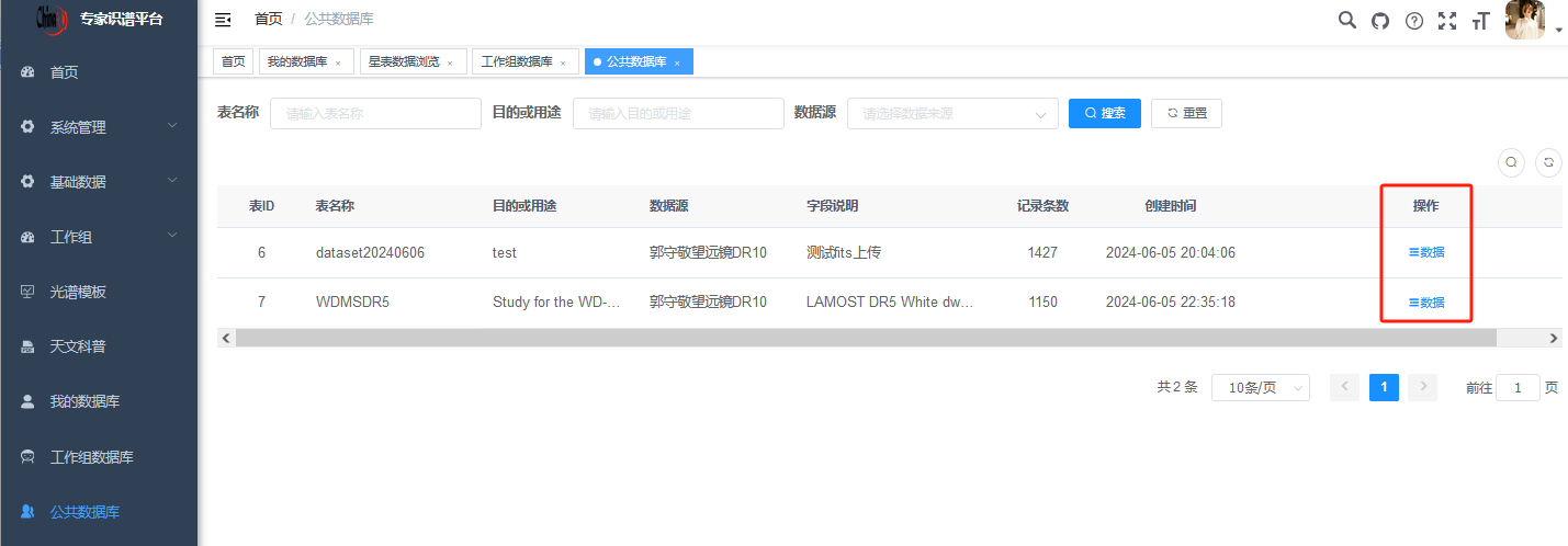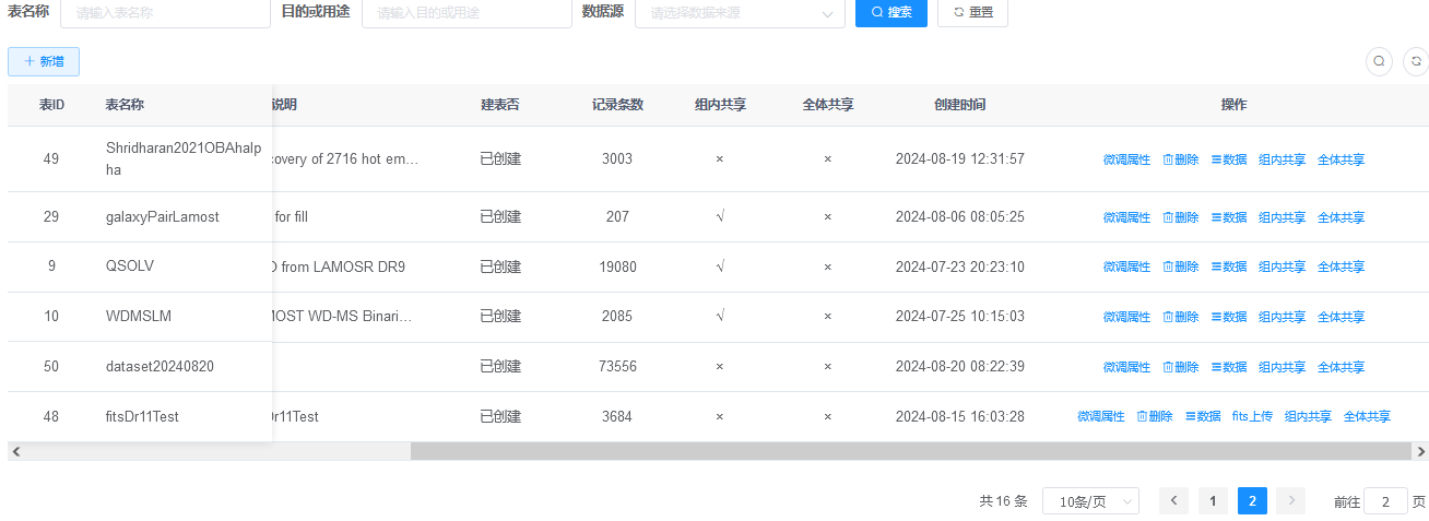下图是点击菜单项“公共数据库”后的数据表列表。可以看到,列表上方只有检索条件 输入框,没有“新增”按钮;列表右侧的可操作项只有“数据”超链接,不会有修改、微调 属性、删除、fits 上传、组内共享、全体共享等超链接,因为这属于创建者的权利。