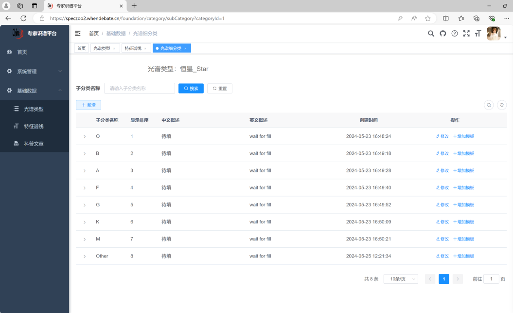 5 、经过艰苦的努力,用户在几周内识别 50-100 条光谱,逐一提交工作成果,有些低分辨率光谱实在不好辨认,AI 推荐也不靠谱,用户可在光谱类别 这一栏选“其它”,备注说明中填“未知”。如果任务要求辨认的光谱已经全部处理并提交, 当前子任务的状态将会自动变更为“已提交”。