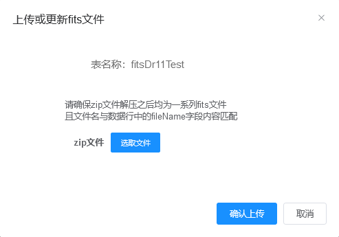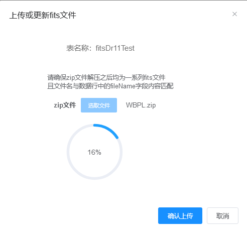 2 、在弹出的“上传或更新 fits 文件”对话框中,选择 zip 文件,然后点击“确认上传” 按钮。与上传 csv 文件类似,如果文件尺寸较大,会有进度条;只有进度条到达 100%,点 击“确认上传”按钮才有效。