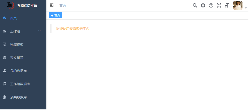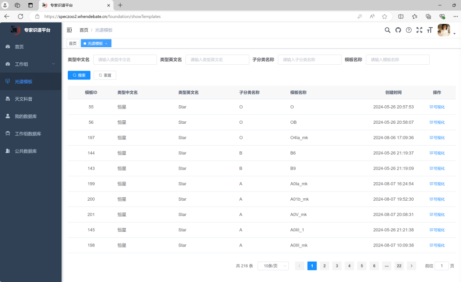 专家识谱平台是一套集光谱数据管理、光谱可视化分析为一体的科学、科普、教研支 持服务系统。平台主要为天文学家、天文教育工作者、天文学方向研究生、天文物理专业本 科生、中学天文爱好者提供服务。