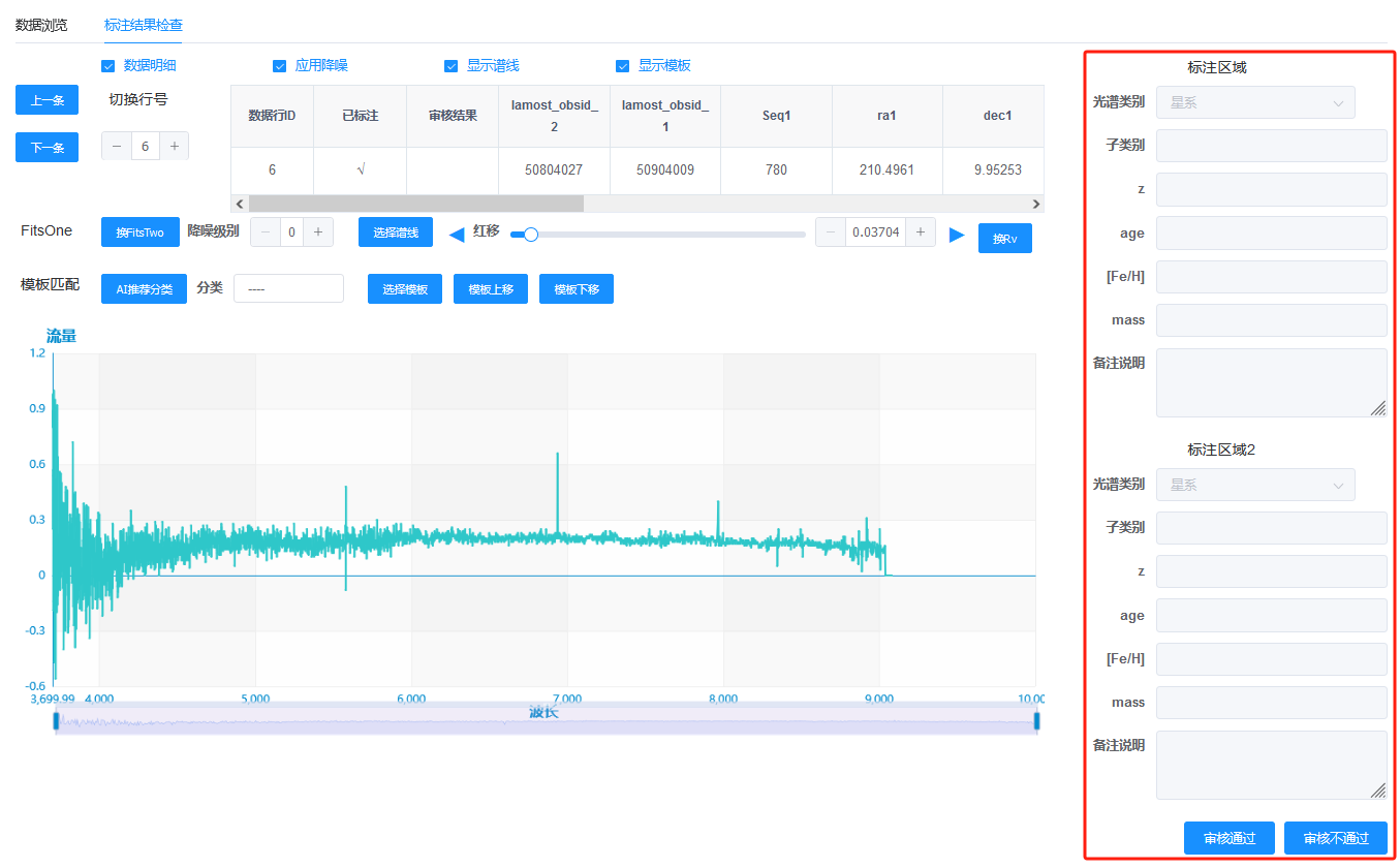 4、组负责人或组管理员按完成人提交的标注结果设定右边的红移值(视向速度)、光谱 类别模板,观察是否基本匹配。如果没有明显的错误,就点击“审核通过”按钮;如果发现 有明显的错误,就点击“审核不通过”按钮,填写审核不通过原因,打回重新修改。