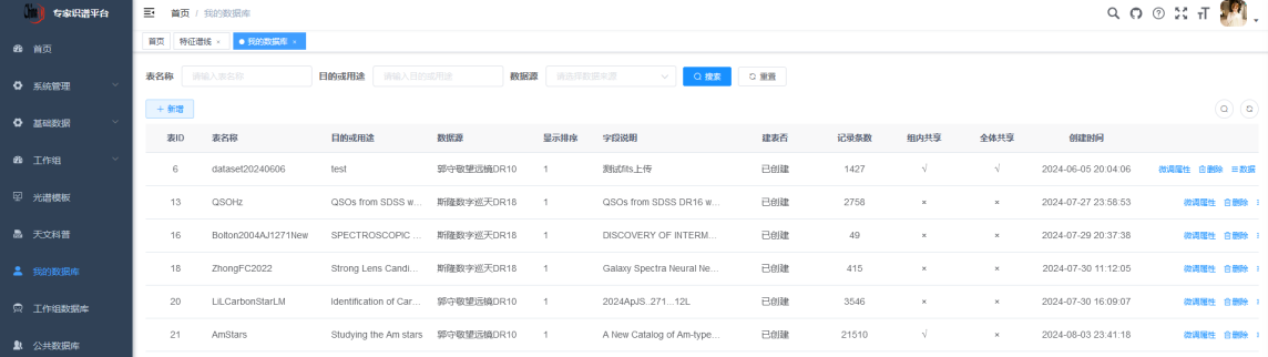 菜单项“我的数据库”界面列表显示的内容是用户本人新建、入库的数据,用户在这里 访问自己上传的星表数据。