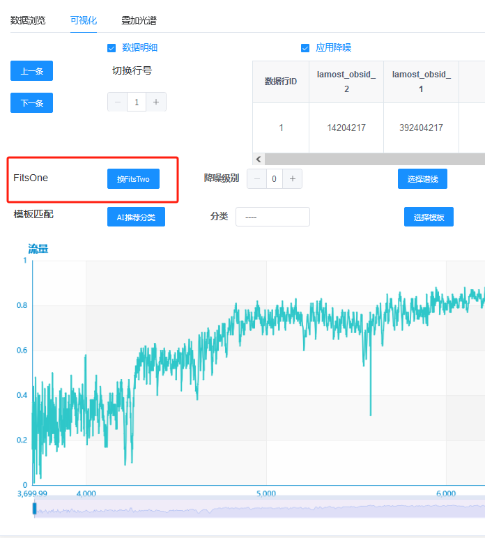 如果这两个条件一个也没法满足,那么可视化界面就只显示数据明细,没有 降噪、谱 线、红移、模板、曲线图表等内容。
