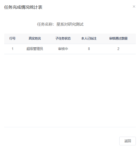 1、组负责人在工作环境中,进入“首页/工作组/识谱任务布置”菜单。界面会列表显 示当前已布置的所有任务。找到相应的任务,在数据行右侧点击“标注统计”超链接。