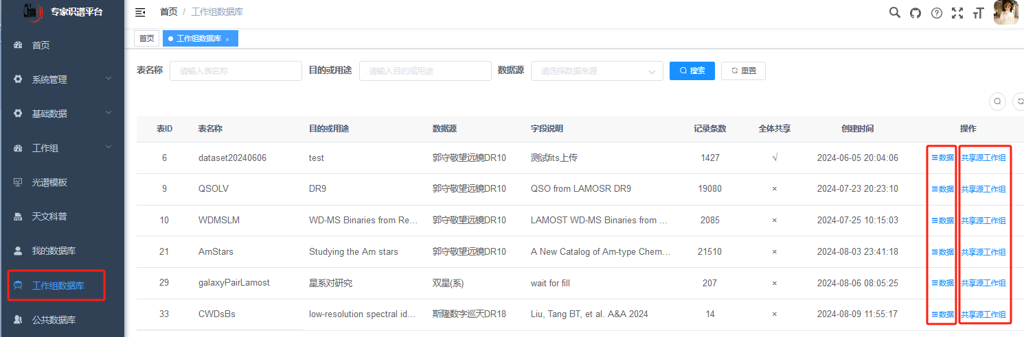 下图是点击菜单项“工作组数据库”后的数据表列表。可以看到,列表上方只有检索条 件输入框,没有“新增”按钮;列表右侧的可操作项只有“数据 ”、“共享源工作组”超链接, 不会有修改、微调属性、删除、 fits 上传、组内共享、全体共享等超链接,因为这属于创建 者的权利。