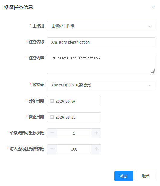 在弹出对话框中调整截止日期、单条光谱可重标次数、每人应标注光谱条数,然后点 击“确定”按钮保存新的属性。