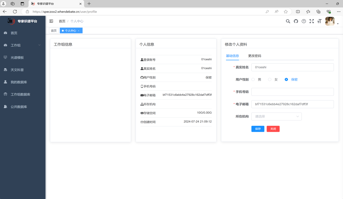 2、进入个人中心,页面上显示有三个卡片,左侧是“工作组”,正中央是“个人信息”, 右侧是“修改个人资料”。用户可以查看核对中央的账号和用户信息,包括“登陆账号”、“真 实姓名”、“用户性别”、“手机号码”、“电子邮箱”、“所在机构”、“存储空间”、“创建时间”。