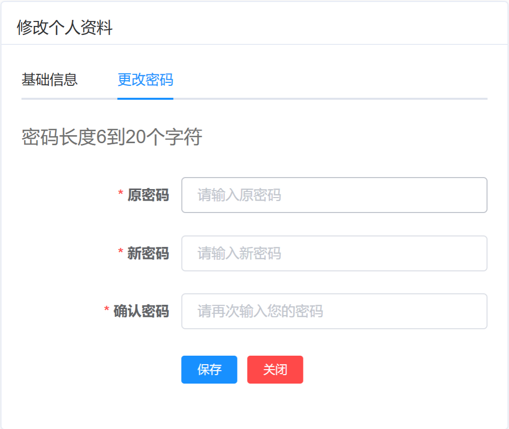 4、 如需更改密码,选中“更改密码”,在对话框内输入“原密码”完成身份确认后, 填写“新密码”,并填写“确认密码” (保证新密码、确认密码两次输入的完全一致以防止输 入错误)。确认输入无误后点击“保存”,完成密码更改。